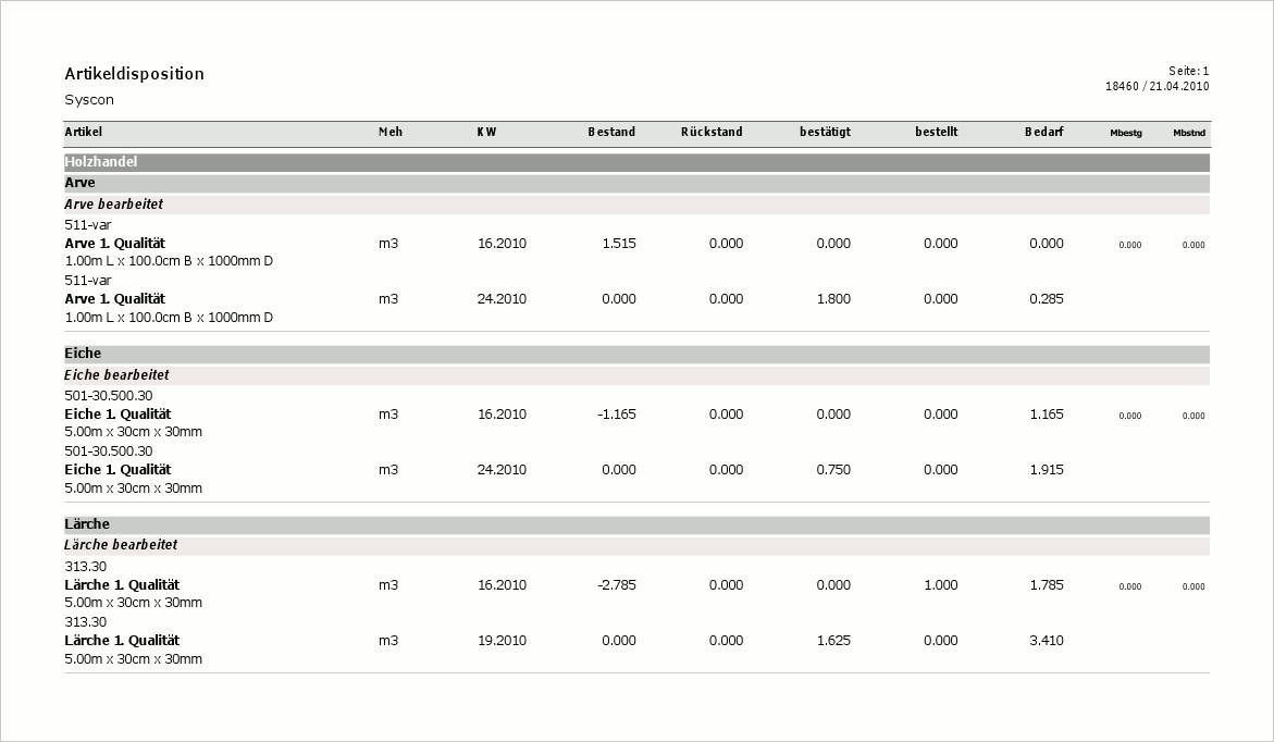 Die Artikeldisposition basiert auf der Bedarfsermittlung gemäss aktuellem Bestand, möglichem Rückstand, bestätigen Verkäufen und bereits bestellten Mengen sowie Mindestmengen für Bestand und Bestellung.